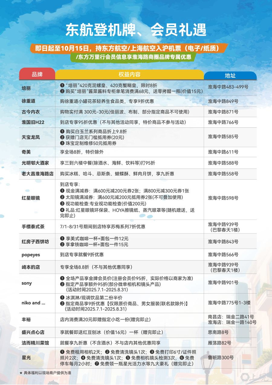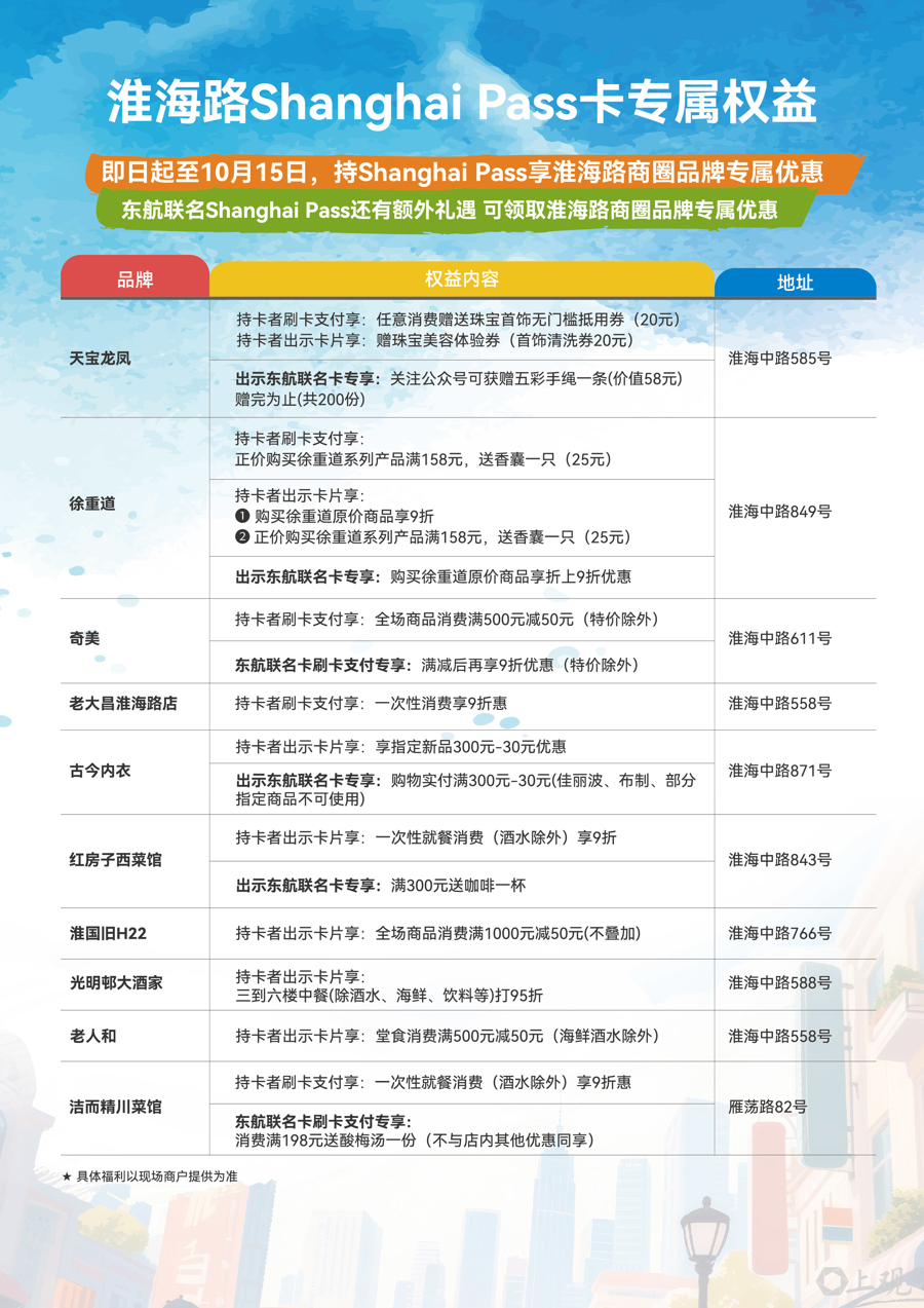 持“东航联名Shanghai Pass卡”游客将成为本次活动的“超级VIP”,在原有商圈权益基础上,可在指定品牌门店解锁专属优惠。